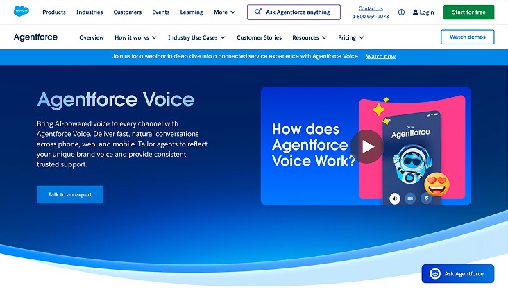 Best for: Enterprises deeply invested in the Salesforce ecosystem that want CRM-native AI voice agents to automate customer service, maintain data continuity, and scale consistent support experiences.