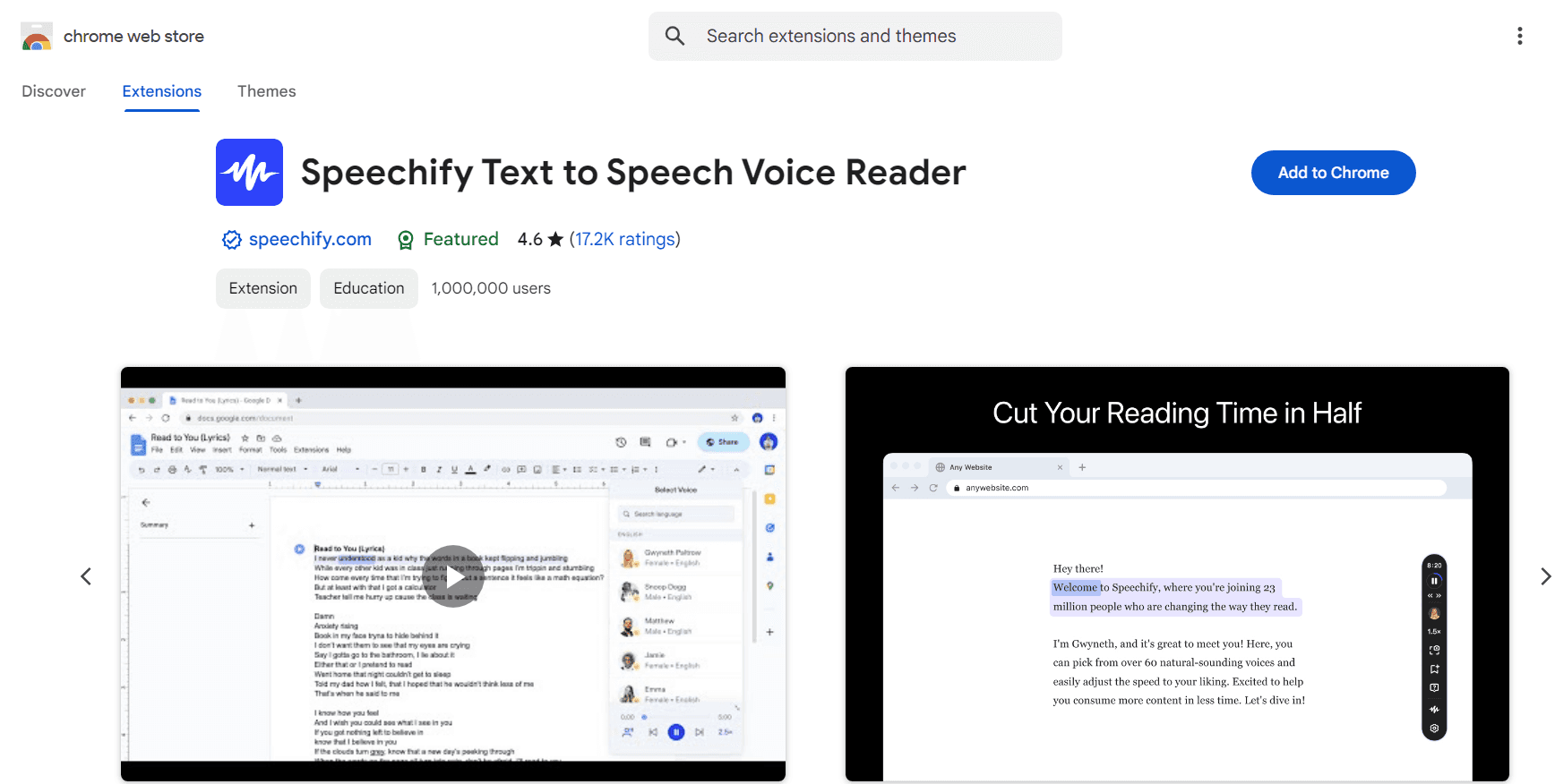 Speechify is one of the most popular text-to-speech Chrome extensions, designed to transform digital content into natural-sounding audio. It allows users to listen to web pages, PDFs, emails, and documents with high-quality AI voices.