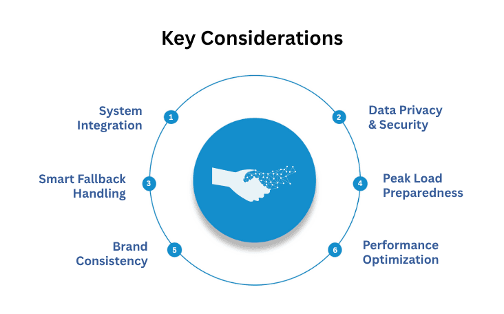 Ensure seamless connection with existing systems, maintain data privacy compliance, plan for scalability, and provide a consistent brand voice. Build fallback options for complex queries and set up monitoring tools to catch and fix performance issues quickly.