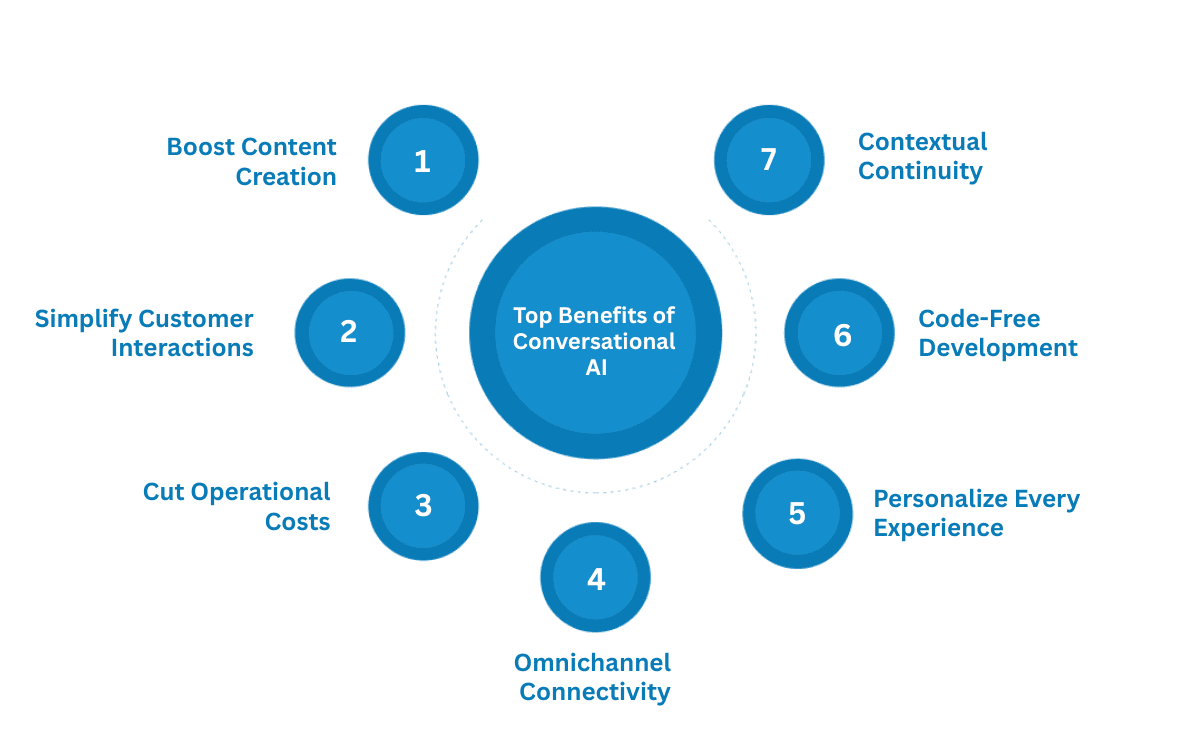Key benefits include faster customer resolution, reduced operational costs, improved personalization, and the ability to manage complex, multi-turn conversations across multiple channels.