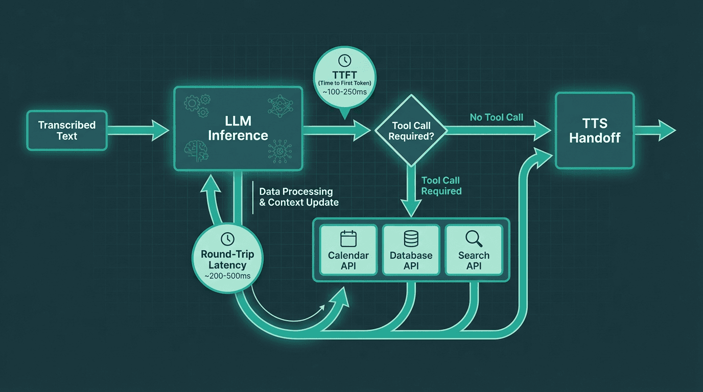 Tool calls introduce a second round-trip. When the LLM decides it needs to call an external API (checking inventory, looking up a calendar, querying a database), the pipeline stalls until that call returns. In voice contexts, every tool call that adds 200ms+ of latency needs to be justified. Common strategies to mitigate this include pre-fetching likely context before the conversation starts, caching frequent tool results, and using smaller specialized models for tool routing rather than sending every query to a large general-purpose model.