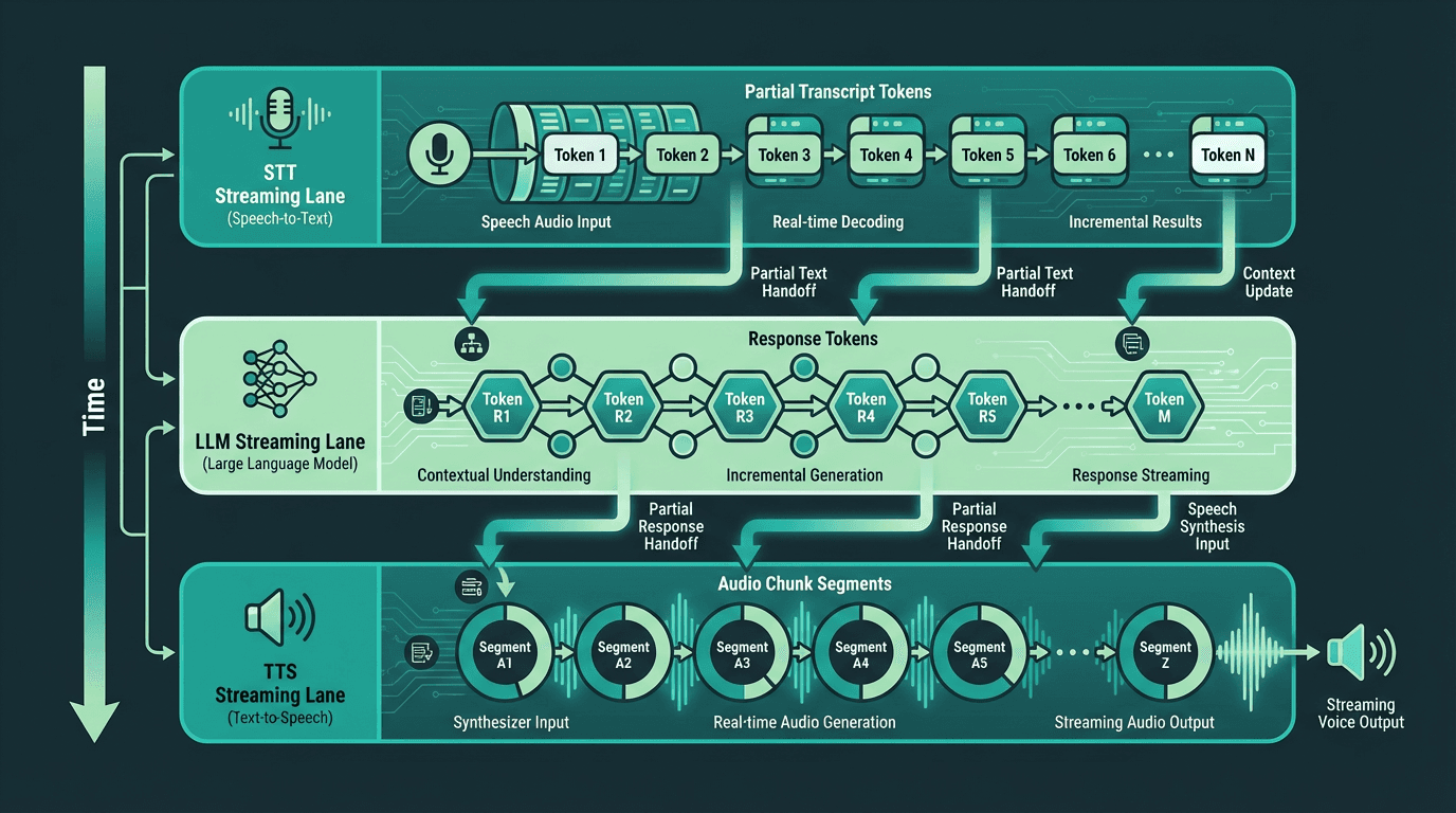 Every component in the pipeline should stream. STT should emit partial transcripts. The LLM should stream tokens. TTS should begin synthesis on partial text. Without streaming at each stage, latencies compound additively. With streaming, stages can overlap, and the user starts hearing audio while the LLM is still generating the tail of the response.