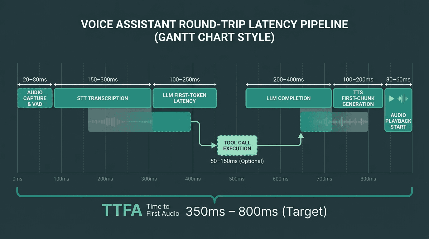 A latency budget is a deliberate allocation of time across pipeline stages, not a post-hoc measurement. You set a target TTFA (say, 800ms for a phone-based assistant), then work backwards to determine how much time each stage is allowed to consume. This forces architectural decisions early rather than discovering latency problems in production.