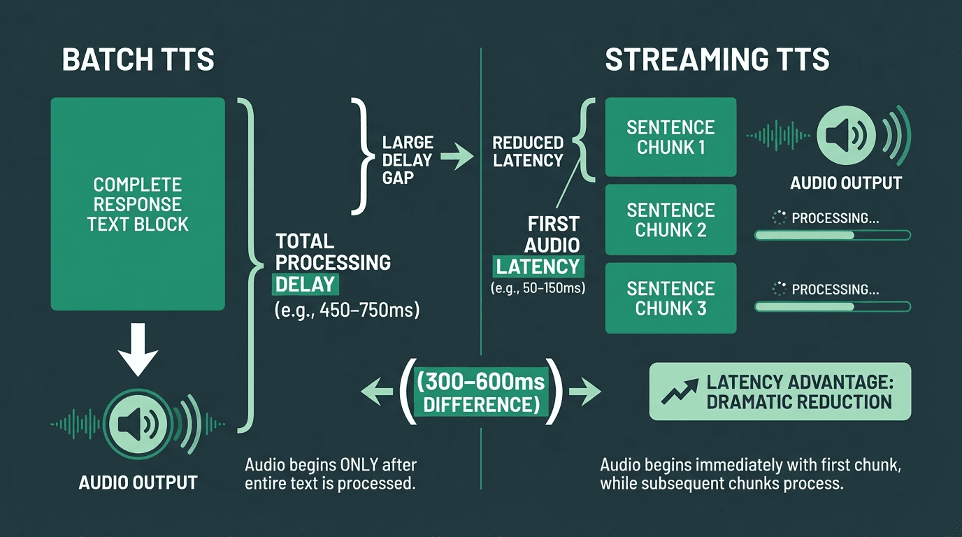 Streaming TTS can cut perceived response latency by 300-600ms compared to batch synthesis.