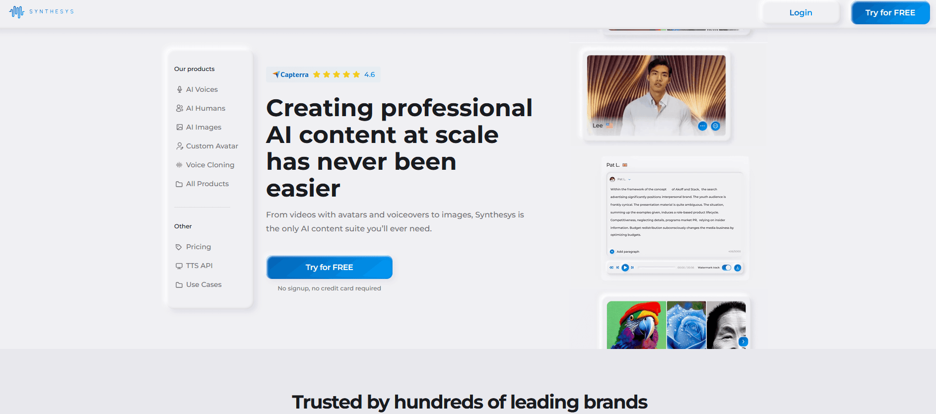 Synthesys delivers high-fidelity AI voices for professional voiceovers with under-2-second generation times. Priced from $30 per month, it focuses on marketing, customer service, and corporate communication. Its premium voice cloning features replicate human-like tone and inflection, providing a robust tool for generating engaging, persuasive audio content for business applications.