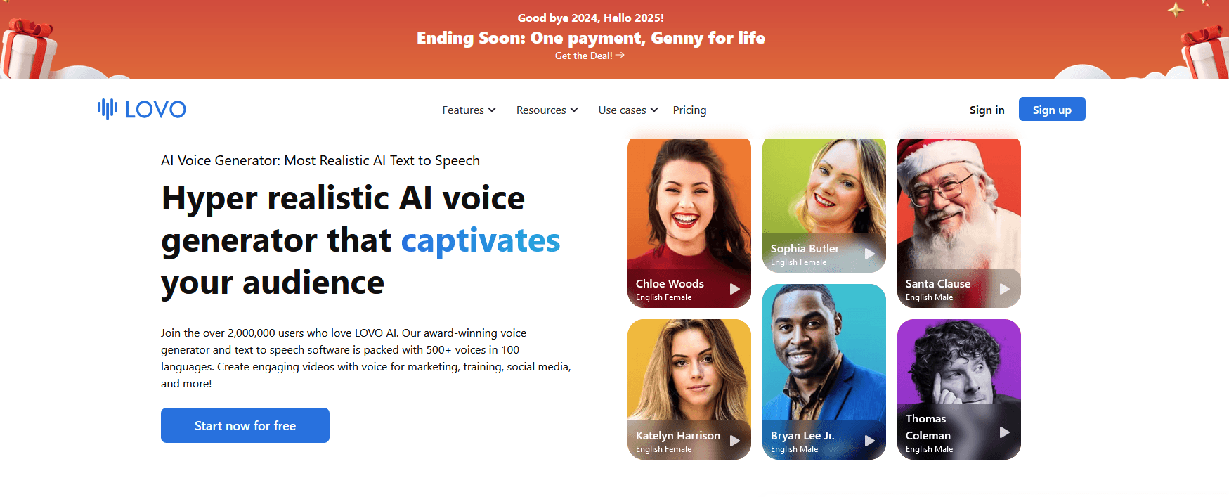 LOVO’s advanced TTS platform caters to content creators, advertisers, and educators with AI voices capable of delivering a wide range of expressive speech. Audio is generated in under 2 seconds, and pricing starts at $15 per month for personal use. LOVO’s extensive voice library offers genre-specific voices suitable for animations, ads, and instructional materials, providing unparalleled realism and flexibility for diverse creative projects.