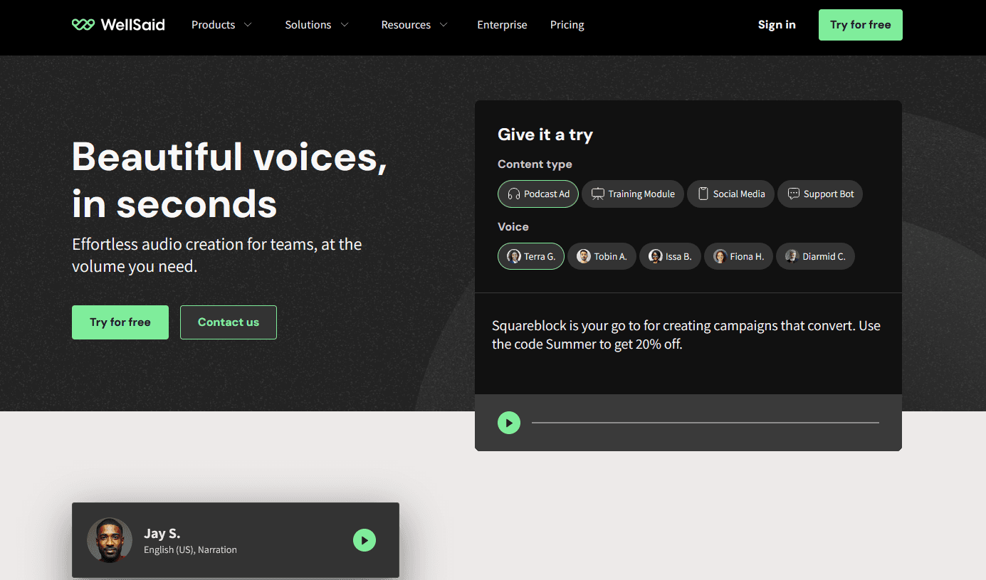 WellSaid Labs offers enterprise-grade TTS and voice cloning with real-time audio rendering and subscription plans starting at $49 per month. Known for its professional-quality voices and emotional depth, it supports video narration, e-learning, and dynamic advertisements. Its powerful APIs allow seamless integration for large-scale business projects requiring consistent, high-quality audio.