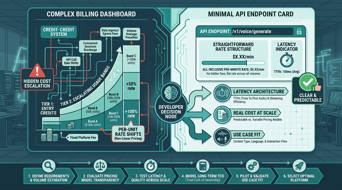 Credit-based pricing obscures real costs. When you are evaluating a platform for production use, convert everything to a per-minute or per-character rate and model it against your actual usage. A platform that looks affordable at the starter tier can become expensive once you cross into higher usage bands where the per-unit rate changes.