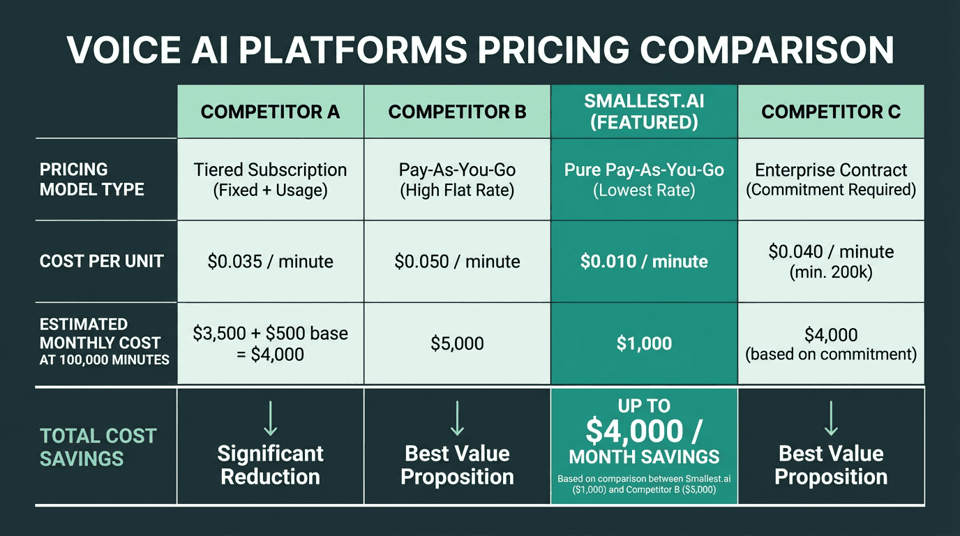 Consider a contact center that automates 50,000 inbound support calls per day, with each call averaging three minutes. At this volume, low latency is non-negotiable for a positive customer experience, and predictable per-minute pricing is essential for managing operational costs. Smallest.ai's model allows the business to calculate a clear, fixed cost per call. A credit-based, higher-latency setup would not only risk frustrating callers with delays but also introduce unpredictable monthly bills that fluctuate with usage patterns and plan tiers. Teams building for scale must map their own call volumes and latency requirements against these two fundamentally different models before committing to a platform.