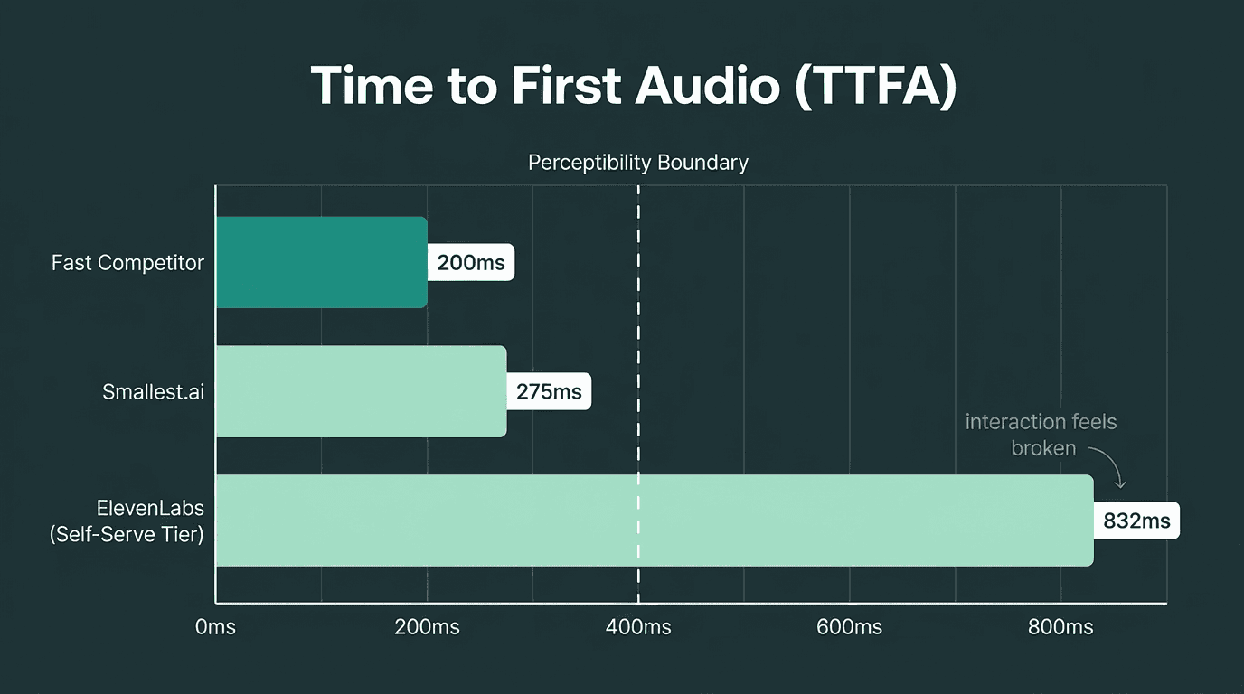 As documented in the TTS Benchmark Report: Smallest.ai vs ElevenLabs, ElevenLabs' TTFA at self-serve tiers sits well above the sub-300ms range that real-time voice agents need to feel natural. ElevenLabs does offer faster 'Turbo' options, but they introduce trade-offs in voice quality and are gated behind specific plan configurations and credit mechanics.