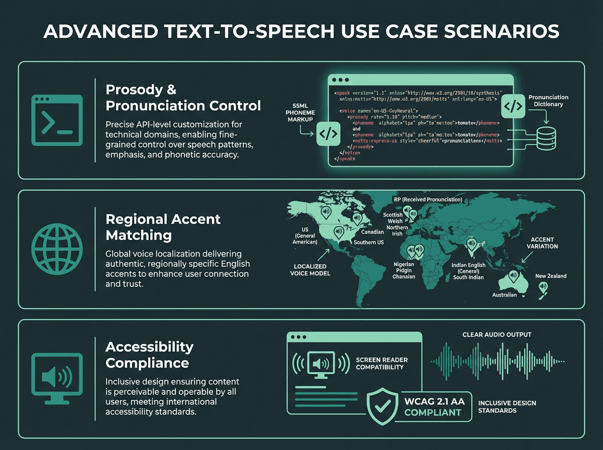 Advanced TTS scenarios: technical pronunciation, regional accent matching, and accessibility compliance