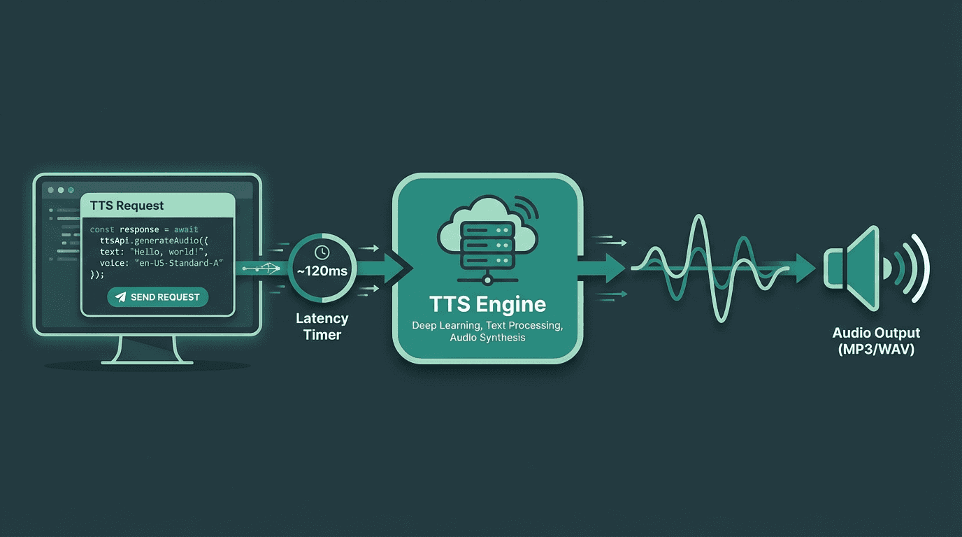 A typical TTS API integration: text input travels to the synthesis engine and streams back as audio in real time