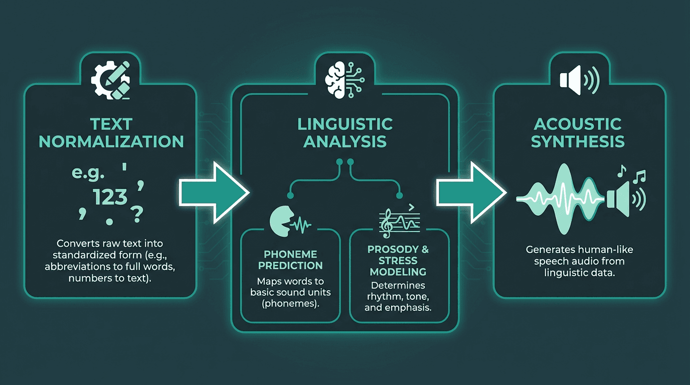 Modern English TTS pipelines run through three stages: text normalization (handling abbreviations, numbers, and punctuation), linguistic analysis (phoneme prediction, stress patterns, prosody modeling), and acoustic synthesis (converting linguistic features into an audio waveform). Acoustic synthesis is where the most dramatic improvements have landed. Neural vocoders like WaveNet and its successors capture the micro-variations in pitch, breath, and timing that make speech feel alive rather than assembled. IBM's overview of TTS technology covers these applications well, from accessibility tools to enterprise automation.