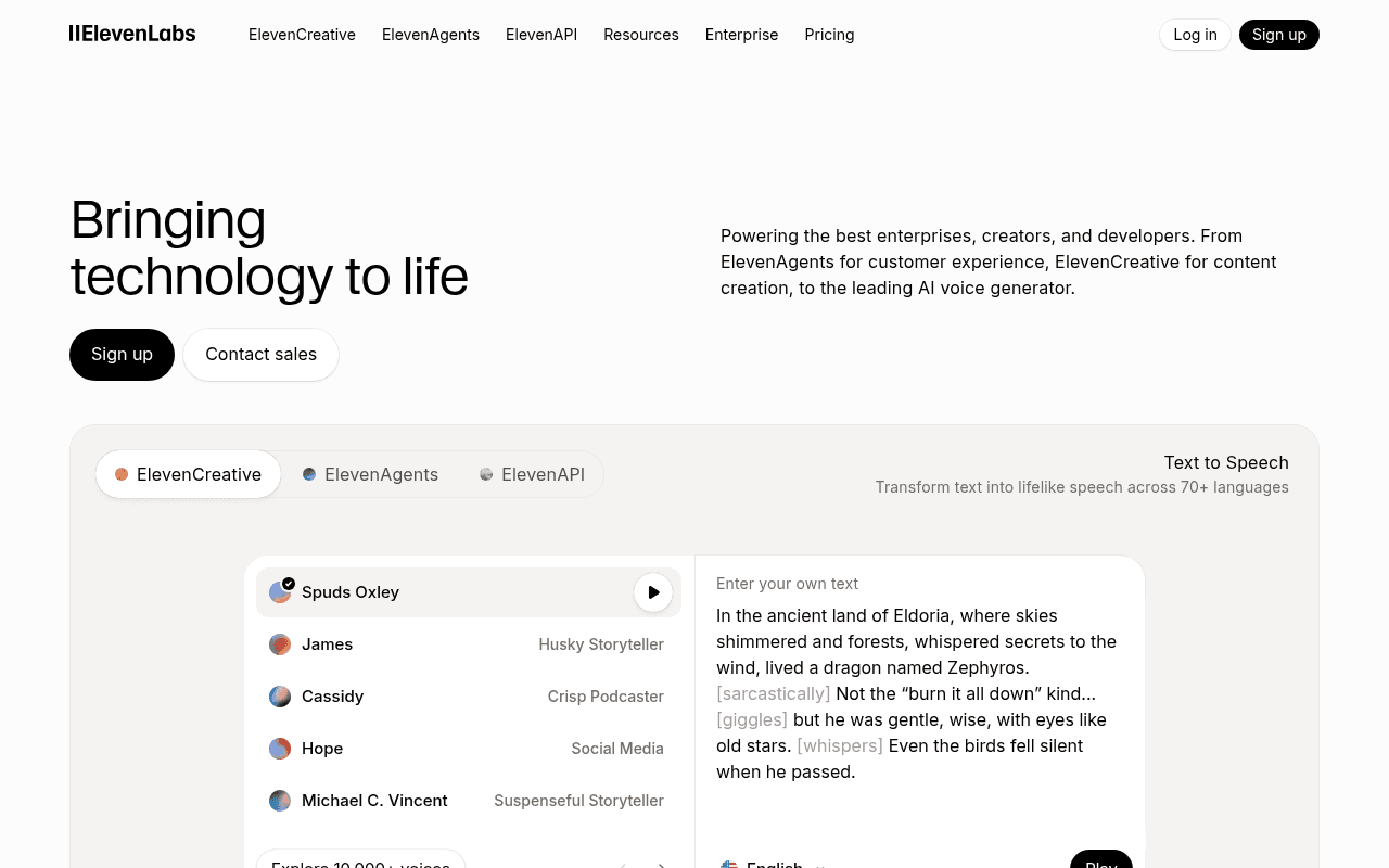 ElevenLabs is the platform most people think of when voice quality is the primary concern. Its multilingual v2 model produces some of the most natural-sounding speech available, with nuanced emotional range that holds up well for long-form narration, audiobooks, and character voice work. The voice cloning is also strong: professional cloning requires only a few minutes of audio and produces results that are hard to distinguish from the original speaker.