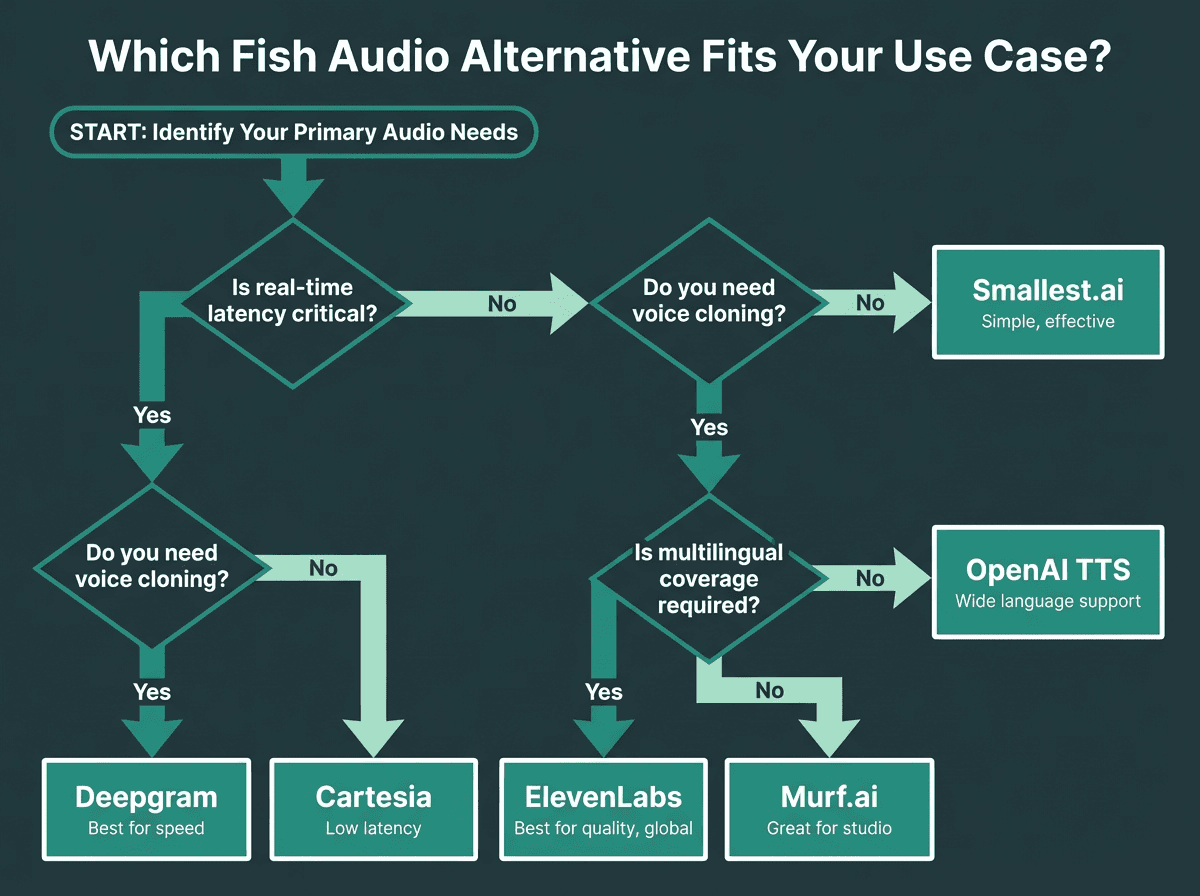 The honest answer depends on what Fish Audio is failing to give you. If the issue is latency for a voice agent or phone application, Smallest.ai is the clearest upgrade path. If you need the highest possible voice quality for long-form content and cost is secondary, ElevenLabs is the standard. If you're already deep in the OpenAI ecosystem and don't need cloning, OpenAI TTS removes friction. For multilingual content production in a web-based studio environment, Murf.ai's accessible interface and 20+ language coverage suit non-technical teams well. And if you need both transcription and synthesis in one API, Deepgram's unified offering makes integration simpler.