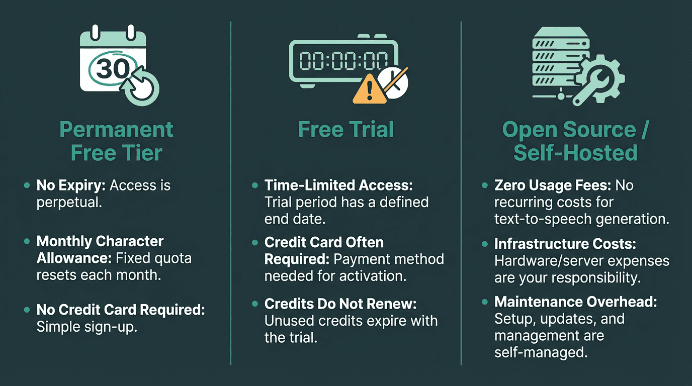 Before comparing platforms, it helps to understand the three distinct categories that get lumped under the word 'free' in TTS marketing. The first is a genuine free tier: a permanent, no-credit-card plan with a monthly character or word allowance that resets. The second is a free trial: time-limited or credit-limited access that expires, often requiring a card upfront. The third is open-source: software you can run yourself with no usage fees, but with infrastructure and maintenance costs that are very real.