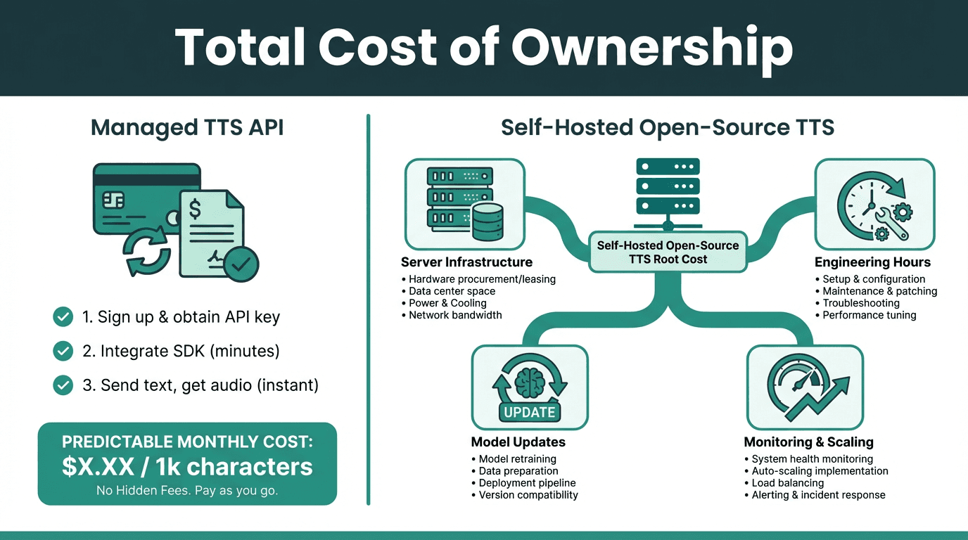 Open-source TTS eliminates licensing fees but introduces infrastructure and maintenance costs that add up.