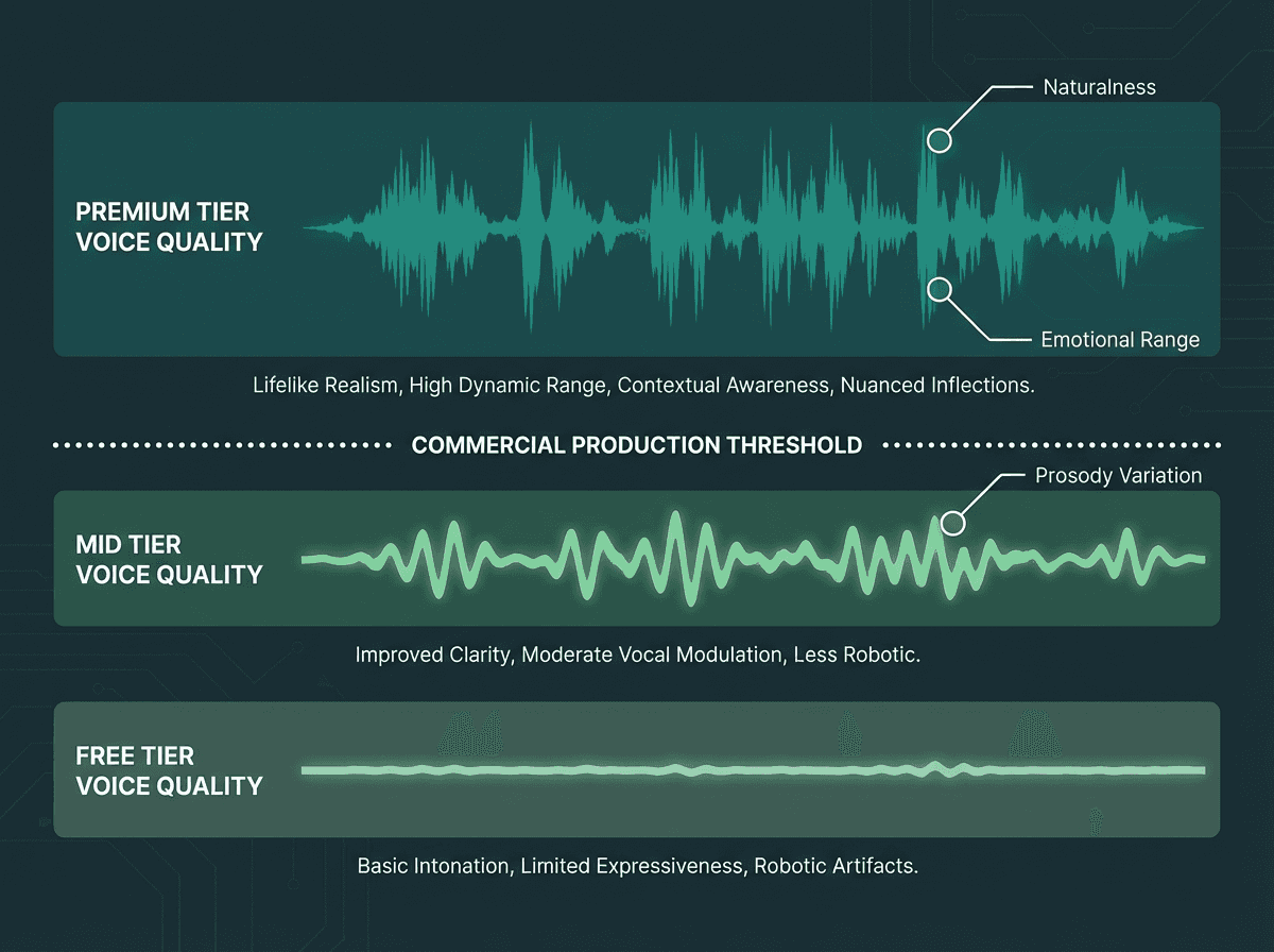 One pattern worth flagging: some platforms deliberately limit voice quality on free tiers, reserving their best models for paid plans. This is not always disclosed clearly. You might test a platform on the free tier, find the quality acceptable, upgrade to paid expecting the same quality at higher volume, and discover the premium voices were never available to you during evaluation.