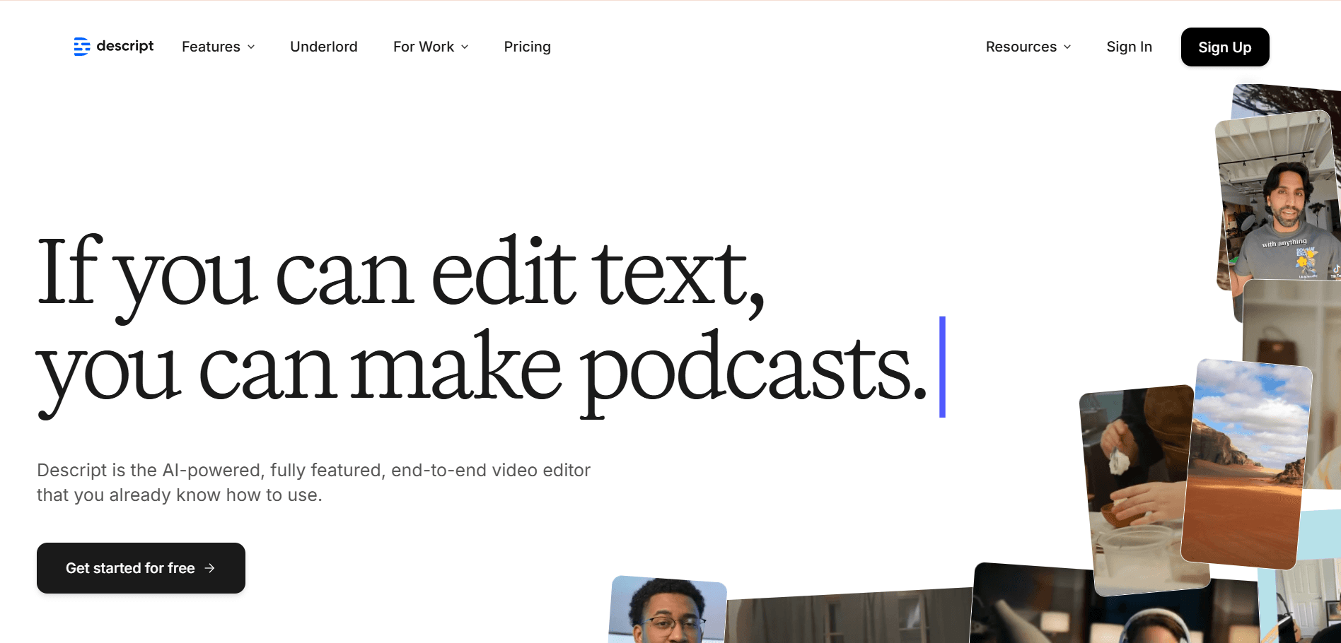 Descript is an all-in-one audio and video editing software that utilizes AI for transcription, podcasting, and voiceovers. It simplifies editing by allowing users to modify audio and video through text-based edits.