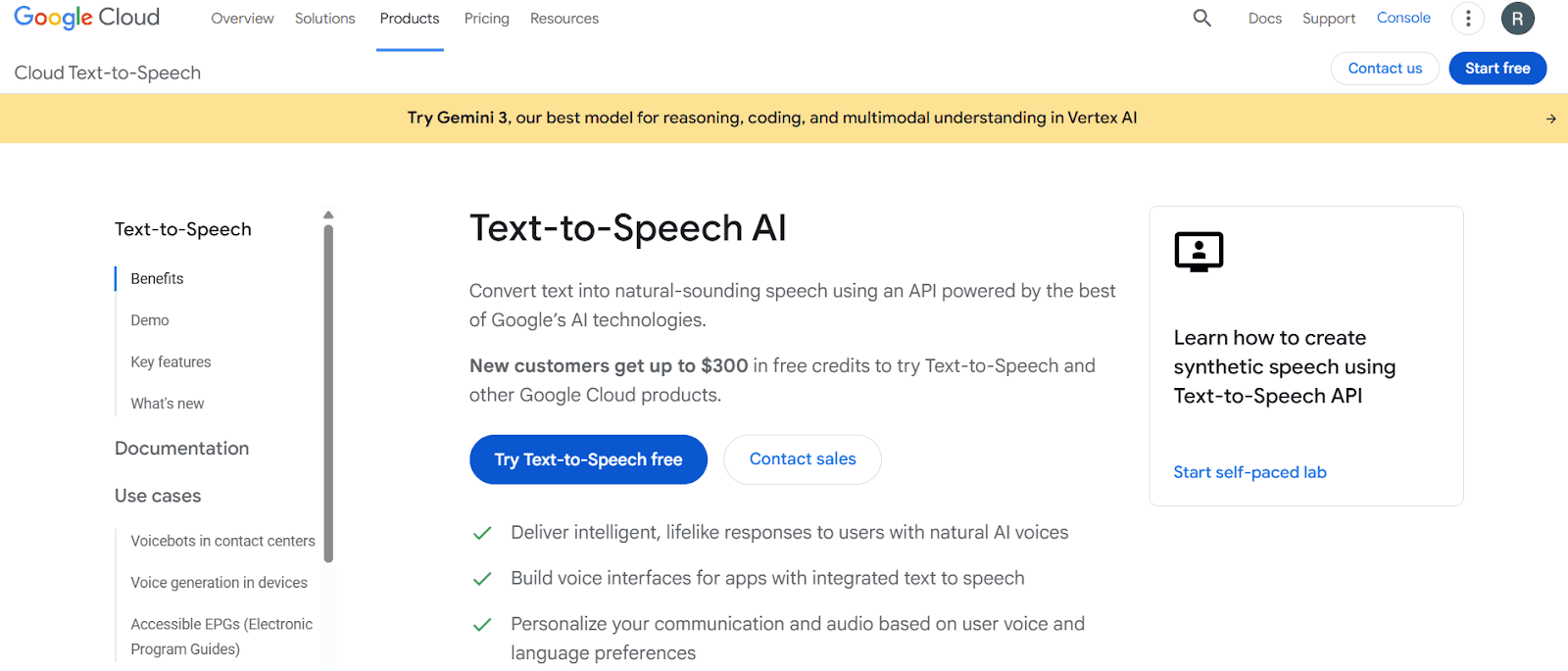 Best for: Teams already in the Google Cloud ecosystem or those needing a high volume of top-tier voice synthesis without an initial cost.