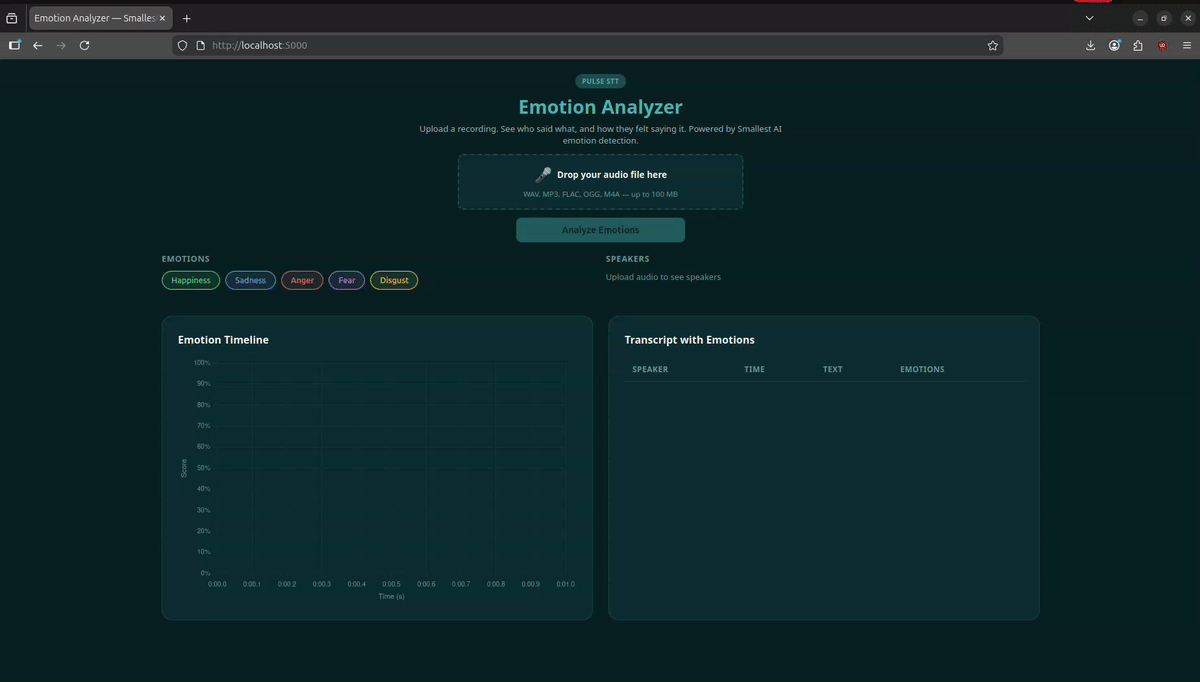 Smallest AI takes a different approach. Emotion detection is part of the speech-to-text response. You send audio to Pulse STT, and you get back transcription plus per-emotion confidence scores in a single API call.