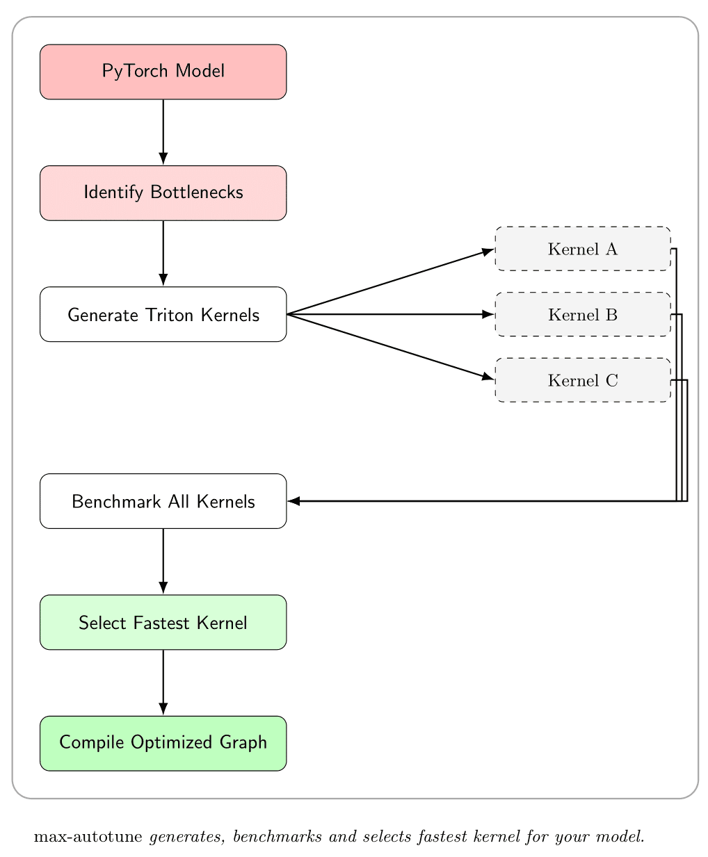 The max-autotune mode doesn't just optimize your existing operations, it generates entirely new ones. Think of it as having an expert mechanic who doesn't just tune your current engine but builds you a completely custom engine designed specifically for your route. It's generating custom Triton kernels specifically for your model's operations.