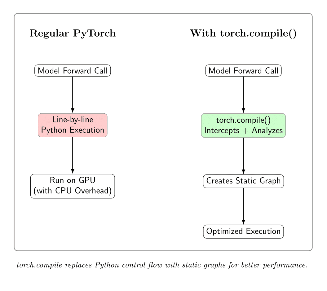 It traces through our model's execution once, recording every operation and decision point. It then creates an optimized computation path. The dynamic Python execution is transformed into static operations similar to compiled C code. PyTorch traces through your model's execution once, recording every operation, every tensor shape, every decision point. It then optimizes this trace, eliminating redundant checks and creating a streamlined execution path as shown in figure 1. The countless if-else statements that Python normally evaluates, checking tensor shapes, determining which CUDA kernels to use, and deciding memory layouts are reduced to a predetermined sequence of operations.