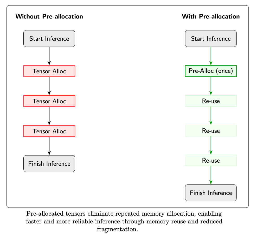 Every memory allocation requires system calls, permission checks, and administrative bookkeeping. Pre-allocation handles this once at the start instead of thousands of times per inference, as shown in figure