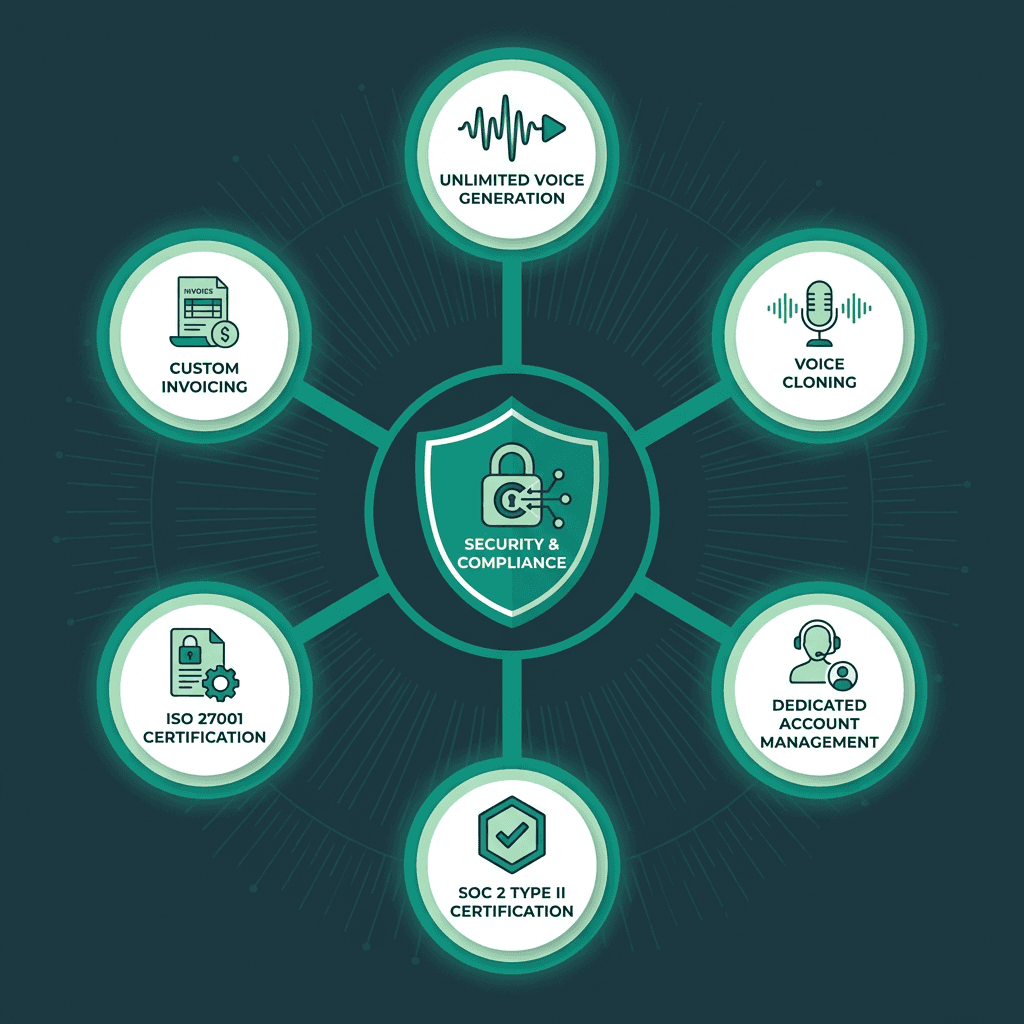 Enterprise: Custom pricing. Unlimited voice generation, SOC 2 and ISO 27001 compliance, dedicated account manager, voice cloning.