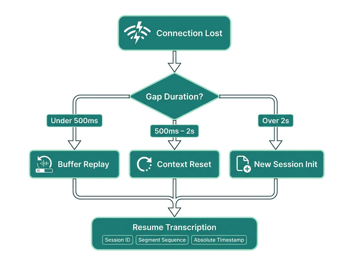The most important thing to instrument is the gap duration. A gap under 500 milliseconds is often recoverable with audio buffering and the engine may not even register it as a break. A gap between 500 milliseconds and 2 seconds will likely corrupt the acoustic context window and produce garbled output for the first sentence after reconnection. A gap over 2 seconds should be treated as a session termination, not a pause.