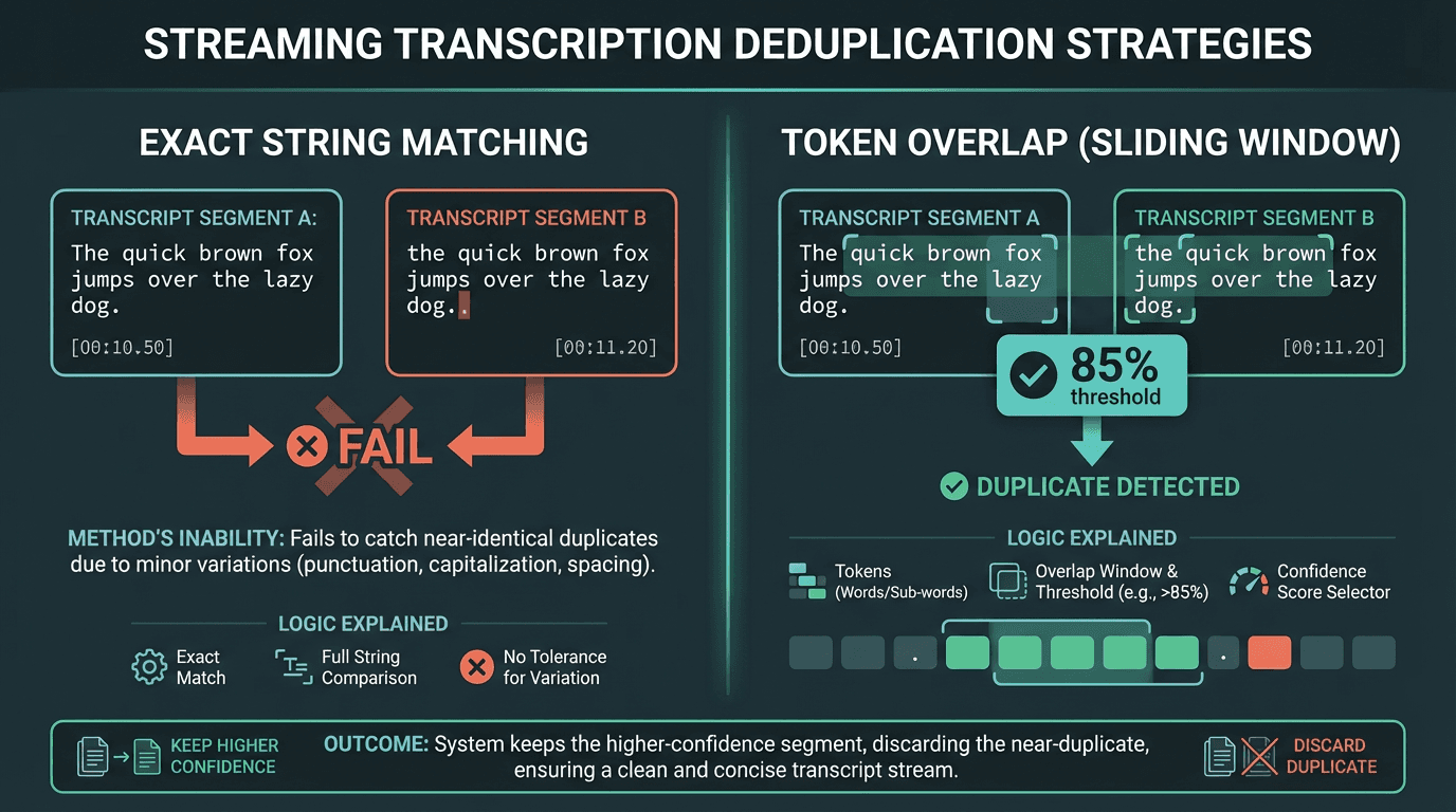 Token overlap deduplication handles the minor transcription variations that exact string matching misses after reconnect replays.