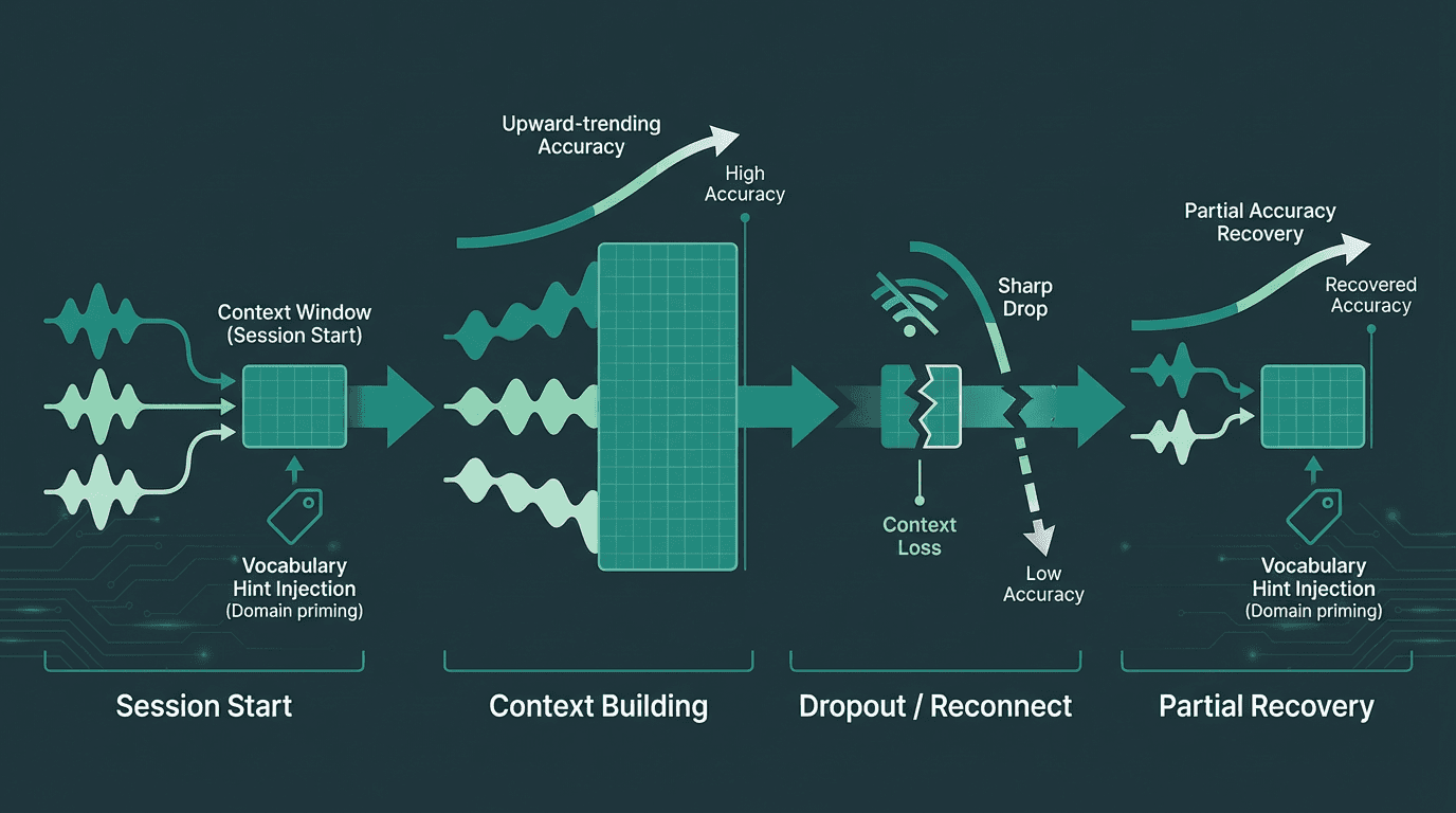 Language model context builds over a session. Reconnects reset it, making vocabulary hints at session start a meaningful accuracy recovery tool.