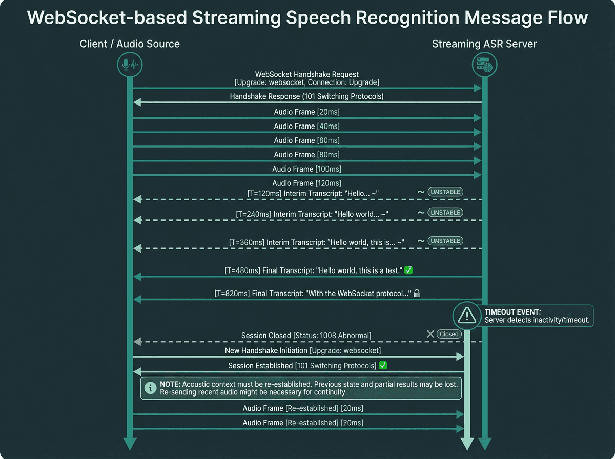 Most production implementations use WebSocket connections because they maintain a persistent channel without the overhead of repeated HTTP handshakes. The audio is typically encoded as PCM or Opus and sent in frames of 20 to 100 milliseconds. The recognition engine maintains an internal acoustic context window, which is why a sudden dropout does not just lose a word. It can corrupt the context for the next several seconds of audio after reconnection.