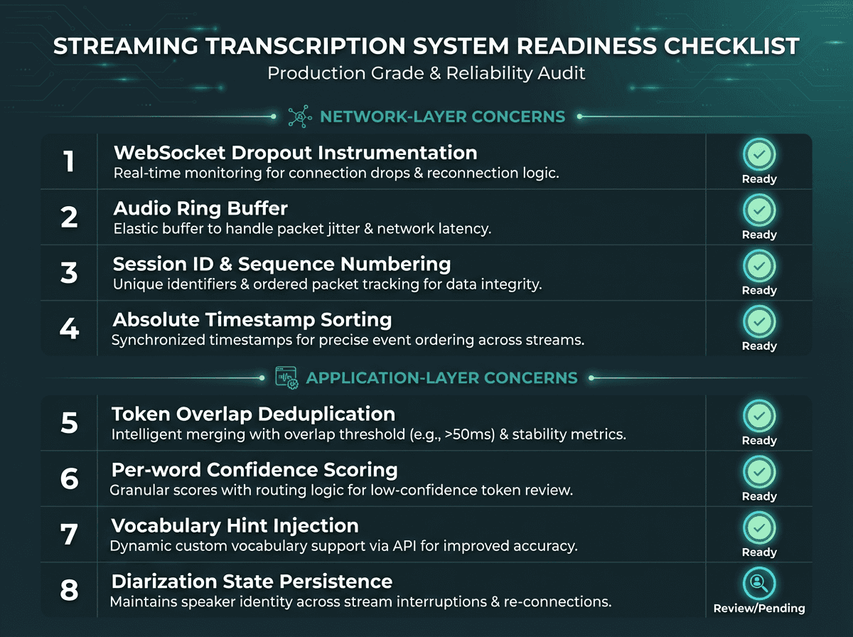 Eight checkpoints that separate a demo-quality streaming transcription integration from a production-grade one.
