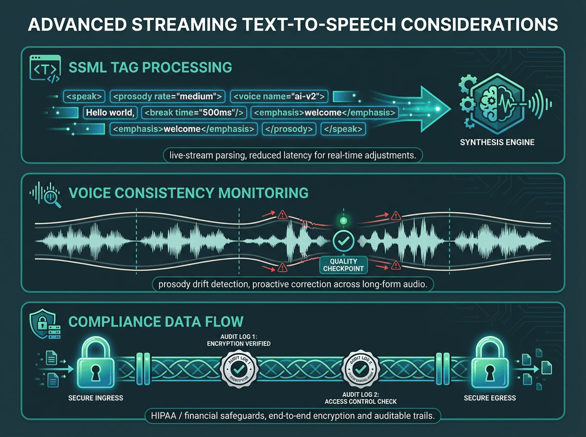 Production streaming deployments need to account for SSML handling, prosody consistency, and data compliance.