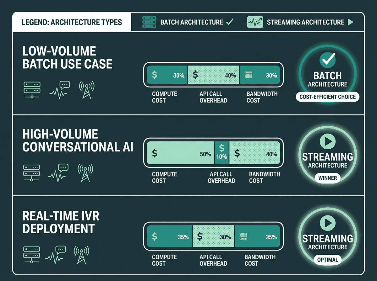 Where streaming can increase cost: if your use case involves very short, static phrases (think navigation prompts or fixed menu options), batch synthesis with aggressive caching is almost always cheaper. You synthesize once, cache the audio file, and serve it repeatedly. Streaming makes no sense for content that does not change.