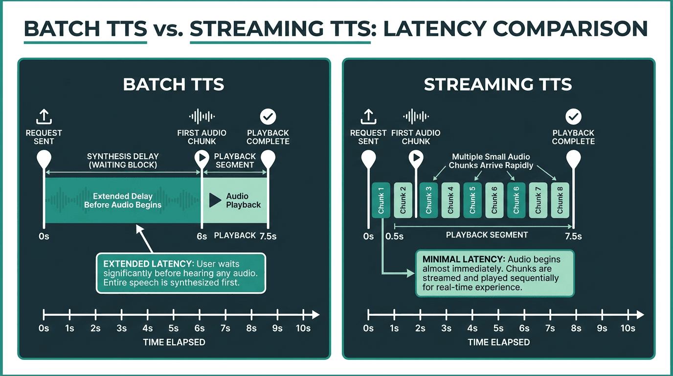 Streaming TTS dramatically reduces the time-to-first-audio compared to batch synthesis.