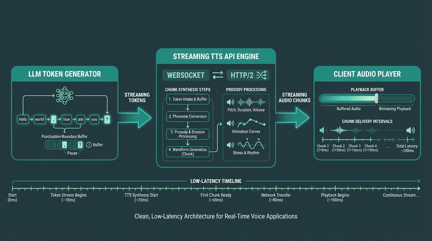 One thing that trips people up: streaming TTS is not the same as low-latency TTS. A low-latency batch API might return a full audio file in 300ms. Streaming TTS might have a slightly higher total synthesis time but deliver the first audio chunk in under 100ms. For conversational applications, that first-chunk latency is what the user actually perceives.