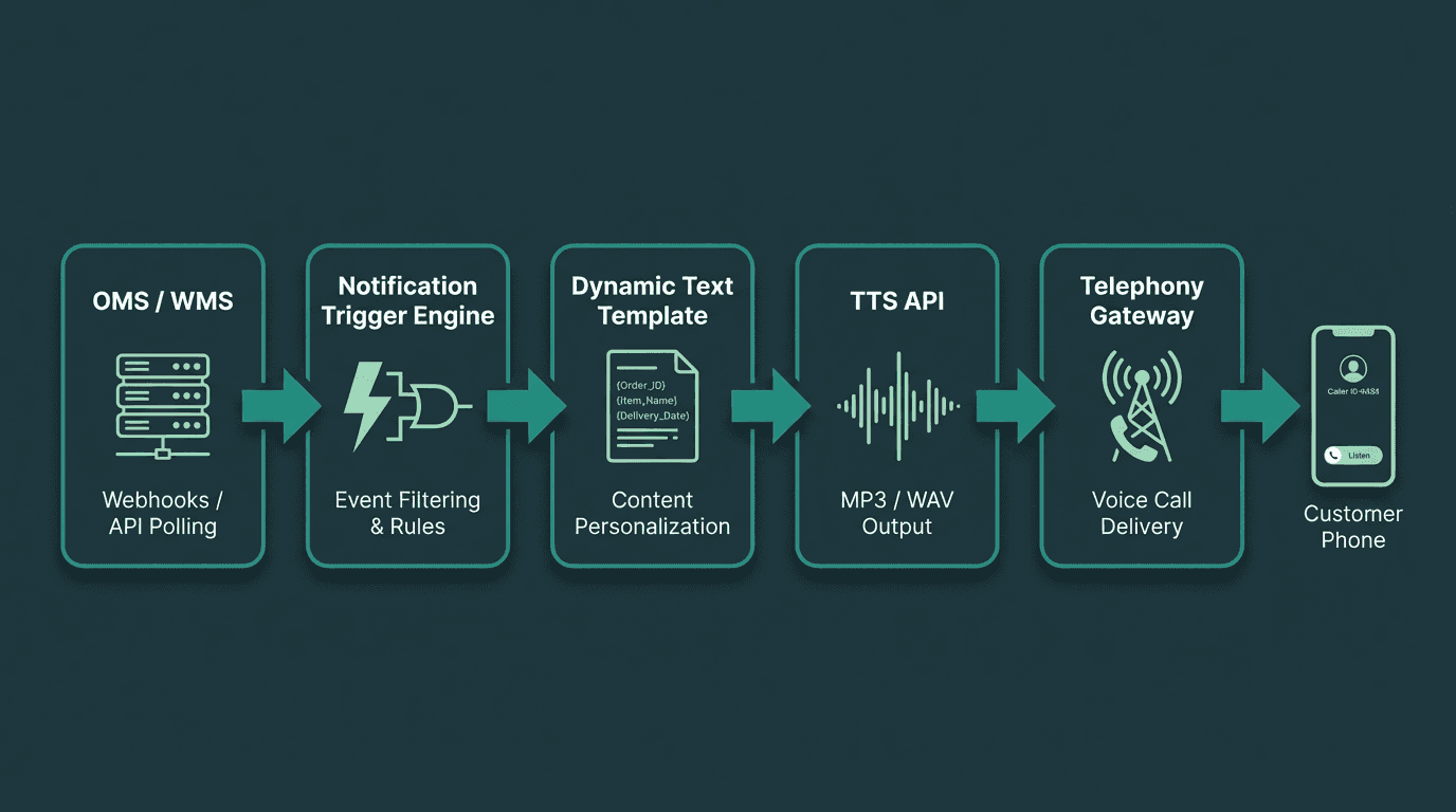 The core pipeline has four components: your order management system (OMS) or warehouse management system (WMS), a notification trigger layer, a TTS API, and a telephony gateway. The trigger layer is where most business logic lives. It listens for state changes from the OMS, such as "order shipped", "out for delivery", "delivery failed", or "return received", then constructs a text string using dynamic variables pulled from the order record.