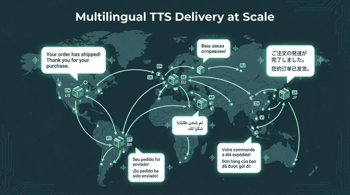 Language detection should happen at the customer profile level, not at the notification trigger level. Pull the customer's preferred language from your CRM or account settings before constructing the template string. This is far more reliable than inferring language from shipping destination. Some TTS providers handle code-switching poorly, so test these cases explicitly before going live, especially in markets like Canada (English/French) or Singapore (English/Mandarin/Malay).
