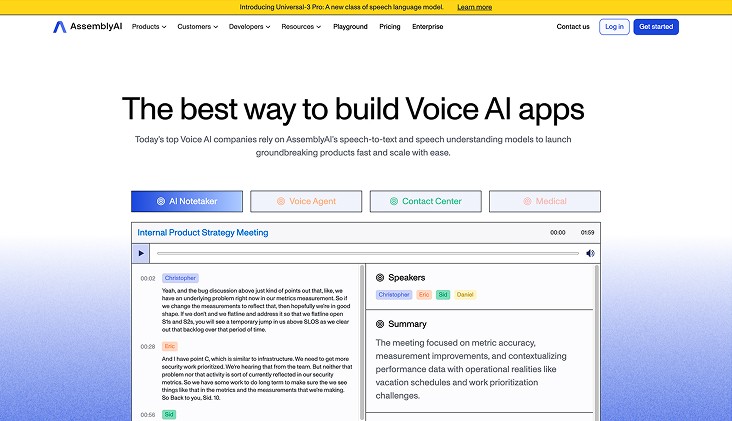 AssemblyAI delivers developer-first speech recognition models focused on transcription accuracy and speech understanding capabilities.