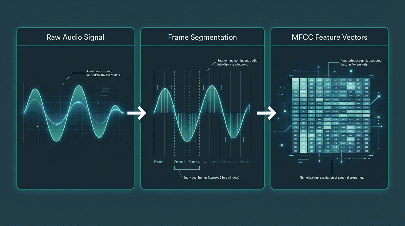 Computers don't 'listen' to audio waves in the same way humans do. They need a mathematical representation of the sound. Feature extraction is the process of converting the cleaned audio signal into a format that a machine learning model can understand. This involves breaking the audio into small, overlapping frames, typically around 25 milliseconds long.