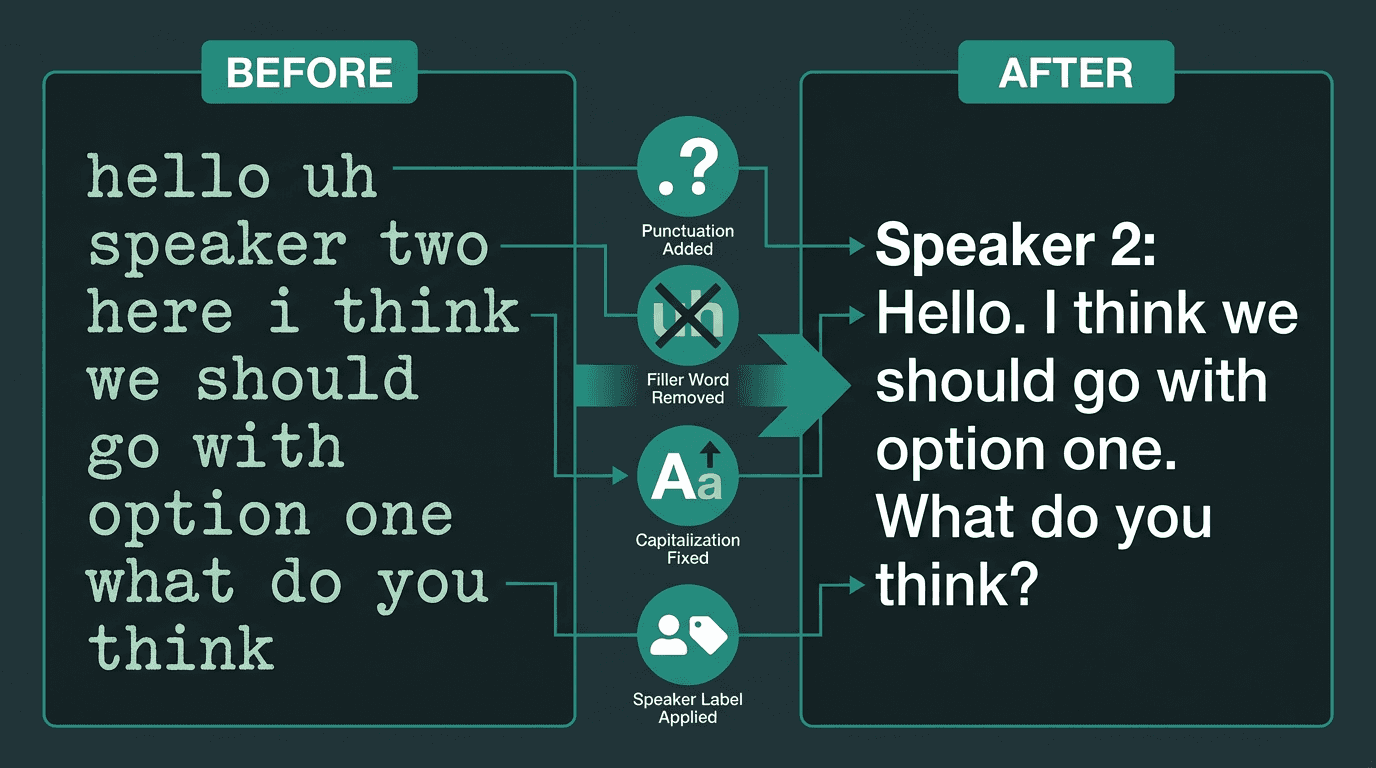 Post-processing transforms raw text into a polished, readable transcript with speaker labels and proper formatting.