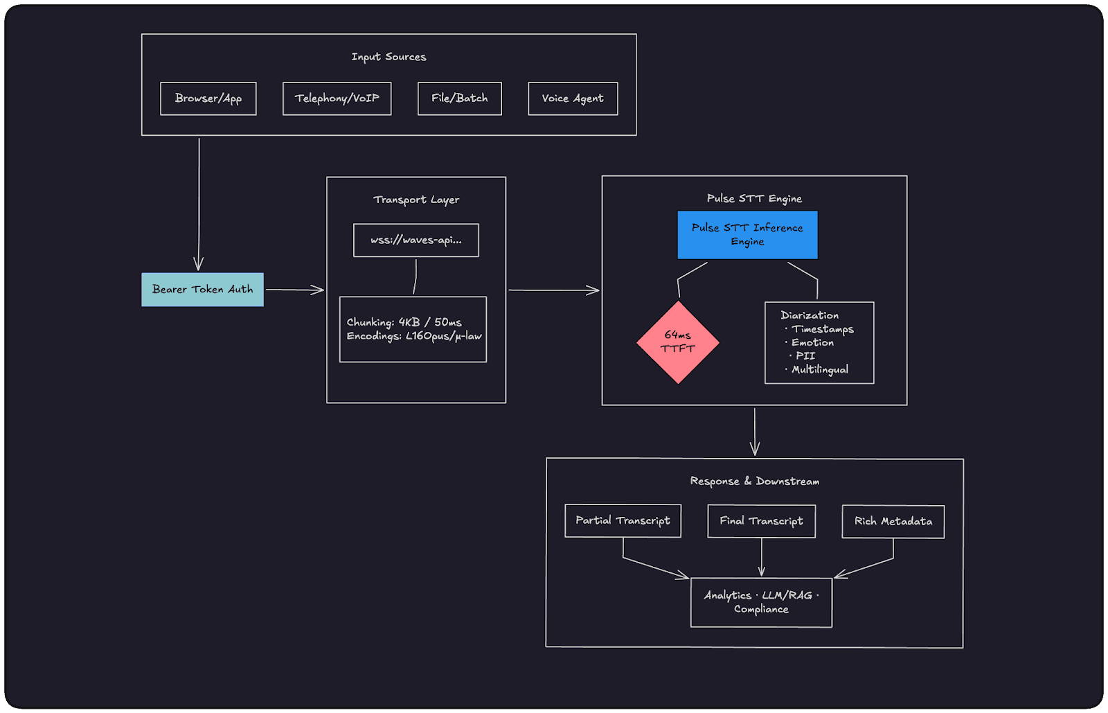 The Waves Pulse STT API was built with all of these constraints in mind. The rest of this guide walks through exactly how to integrate it, with real code, so you can validate these claims against your own workloads.