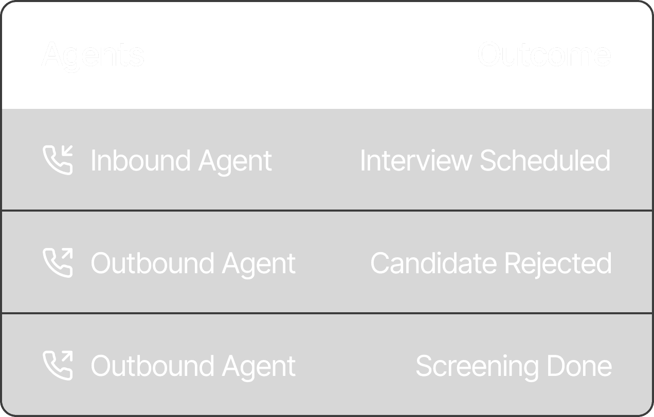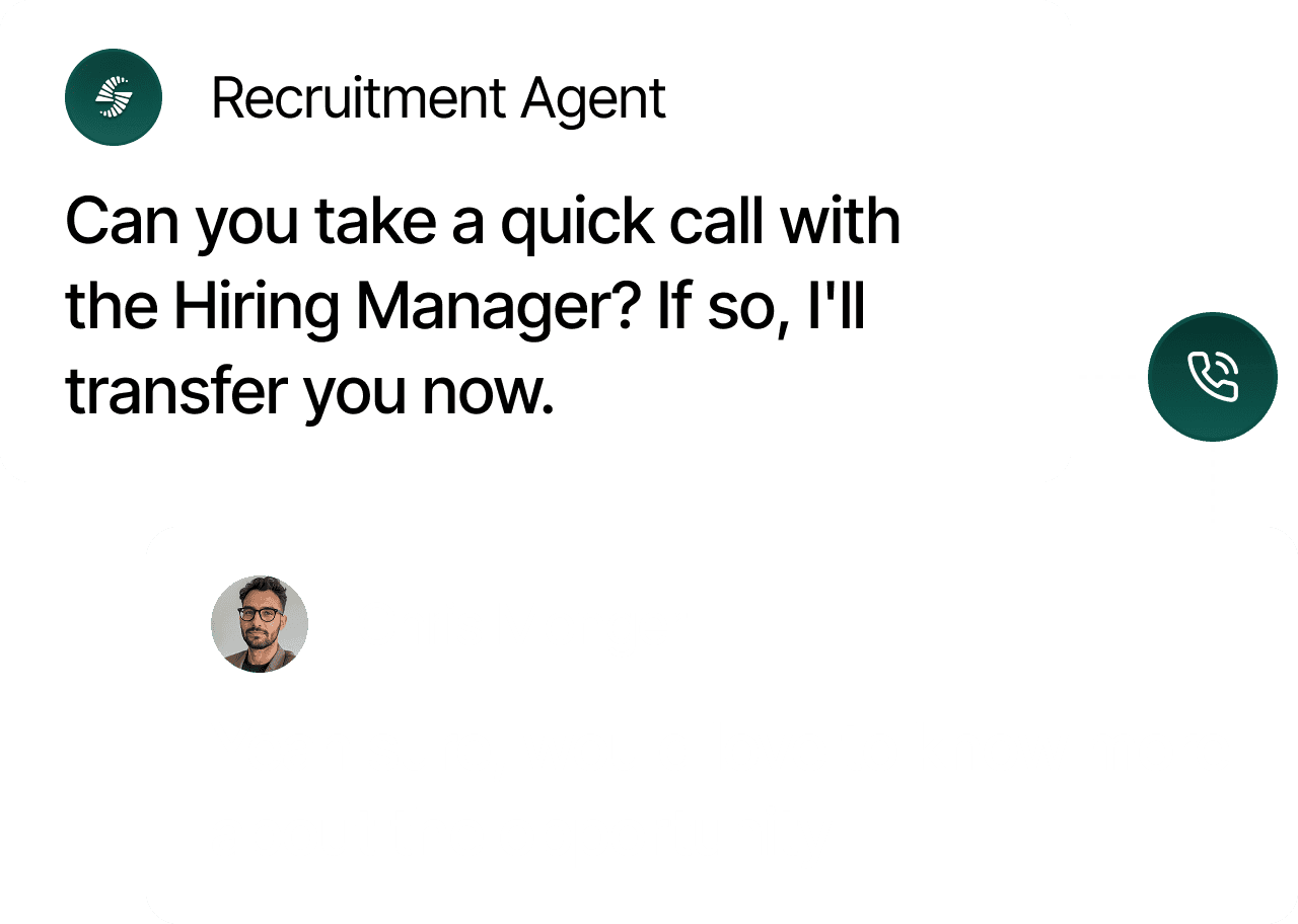 Automated voice agents that screen, engage, and schedule- so your recruiters can focus on hiring, not chasing.