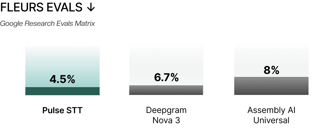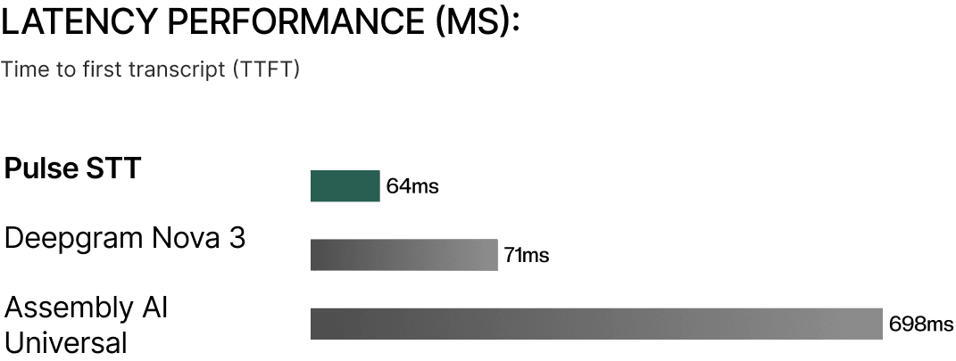 Pulse STT outperforms the competition with the lowest Word Error Rates across 30+ languages and sub-70ms latency for seamless, real-time conversations.