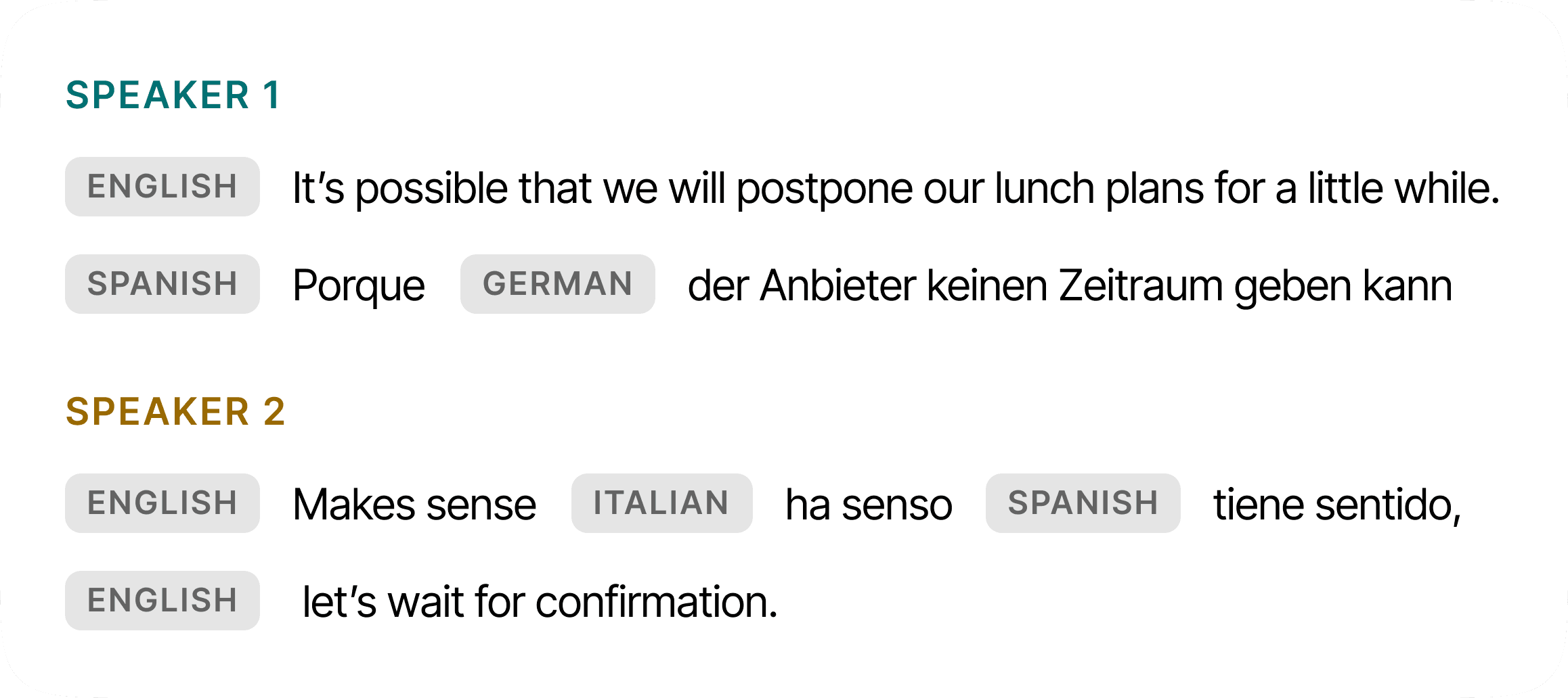 People naturally switch languages mid-sentence, like “Ich zahle mit Apple Pay, falls der Laden cashless ist.” Pulse catches every shift in real time and transcribes each word in the right language.