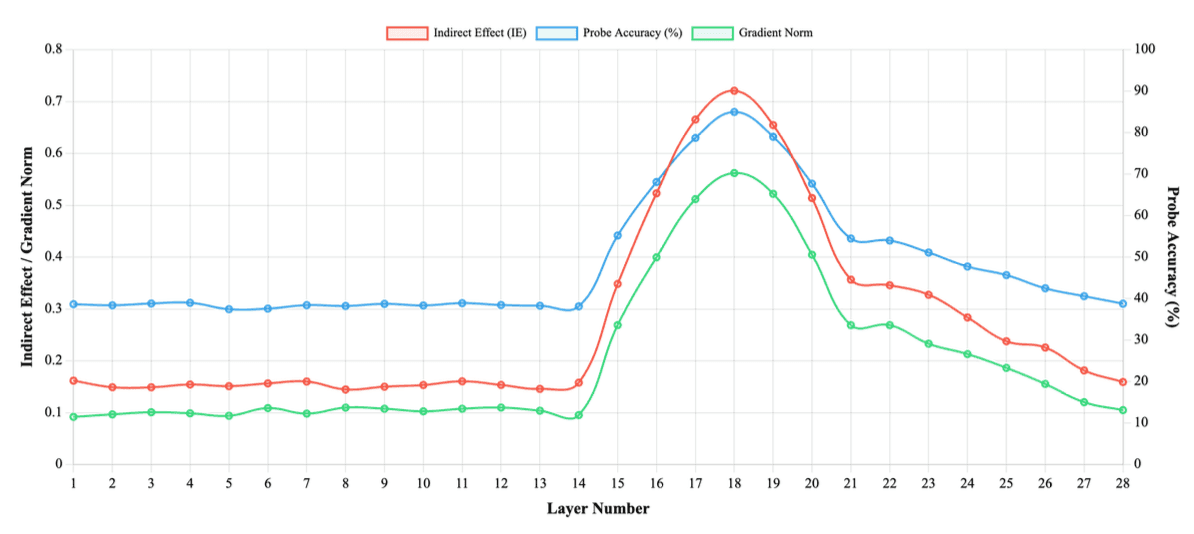 Figure 3: Three complementary analysis methods show convergent evidence that layers 15-21 encode phonetic information: causal mediation analysis (Indirect Effect, red), linear probe classification (Probe Accuracy, blue), and gradient-based attribution (Gradient Norm, green).