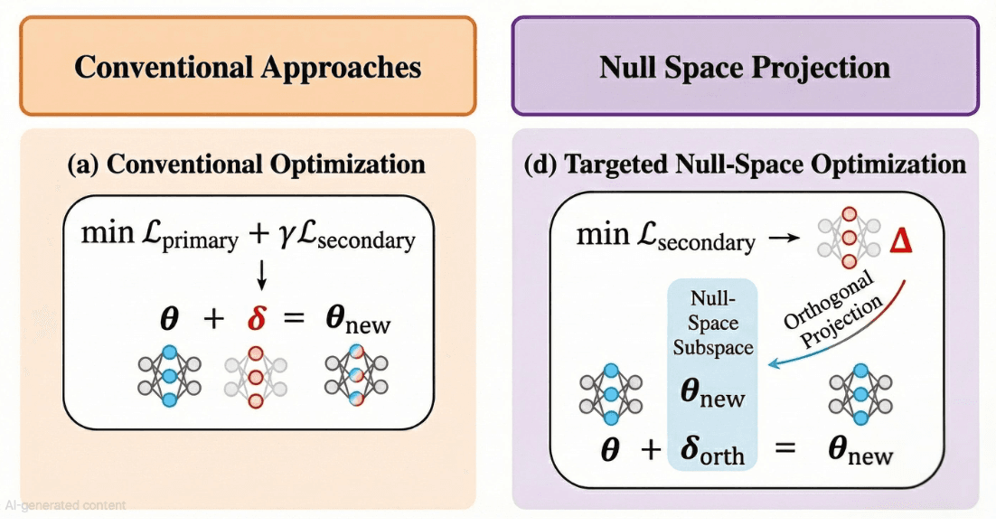 The core insight of these methods is that knowledge in neural networks is often localized to specific layers or subspaces. By operating in these subspaces particularly the null-space of the forward projection, interventions can be made orthogonal to existing model behavior, thereby minimizing side effects. ROME, for instance, uses rank-one updates to correct factual associations in LLMs by computing weight changes that preserve the rest of the model's output distribution.