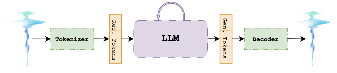 Figure 1: A schematic diagram illustrating an LLM-based speech generation pipeline. A Raw Waveform is first processed by a Tokenizer to produce a sequence of Discrete Tokens. These tokens are then input into a Large Language Model (LLM), which generates a sequence of New Tokens. Finally, a Decoder converts the new tokens into a Speech Waveform.